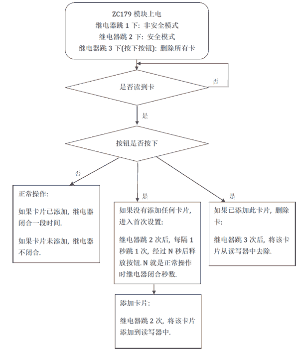 - 加电: 每次加电,继电器如果跳1次,表明工作在低安全状态下. 跳2次则工作在安全状态下.初次加电时,处在低安全状态, 将响应任何125KHz的卡, 默认工作在门锁模式, N=5即继电器闭合5秒.